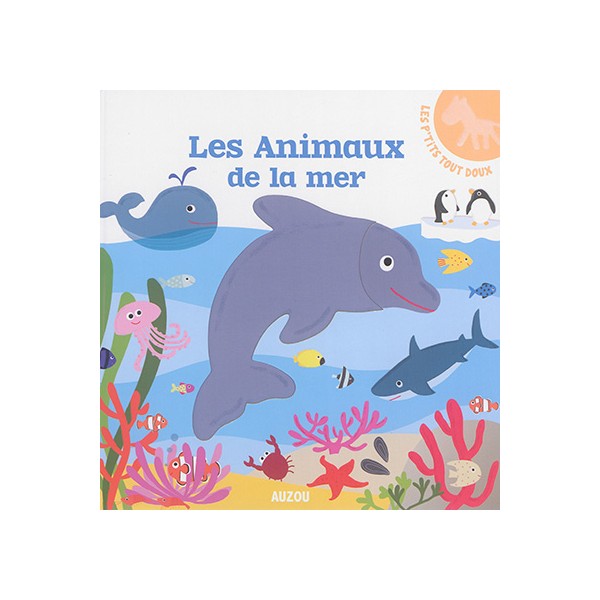 Sur chaque page, un animal marin est présenté avec une matière à toucher : le dauphin, le requin, la méduse, la baleine, l'étoile de mer, etc.