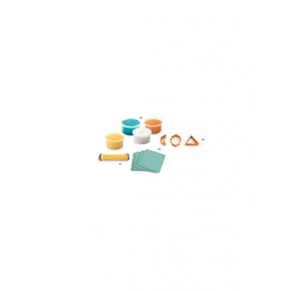 Ce coffret contient : 4 pots de pâte à modeler de 80 grammes, 4 plaques réutilisables, 5 emporte pièces, 4 planches de textures, un rouleau et 1 livret d'explications pas à pas en couleurs.