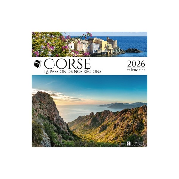Un calendrier mural de septembre 2025 à décembre 2026 avec pour chaque mois une photographie représentative de la Corse : paysage, architecture, gastronomie, faune et flore.