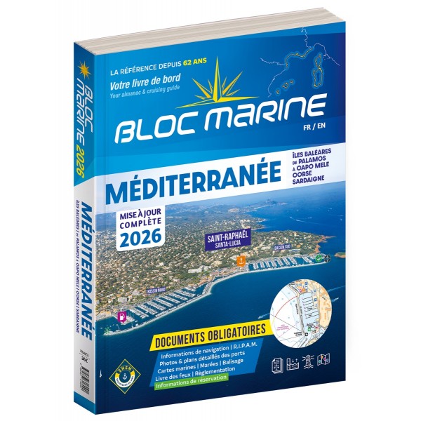 Véritable bible de la navigation de plaisance, le Bloc Marine apporte des informations précises sur les zones portuaires, la sécurité en mer et la réglementation. Il inclut un journal de bord ainsi que les plans des ports en WGS84 et un atlas complet. L'édition 2026 du Bloc Marine comporte un cahier spécial consacré à l’équipement et au confort à bord pour vous permettre d’optimiser les installations de votre bateau et profiter au mieux de vos sorties en mer. Outil indispensable pour la préparation de vos croisières et escales, le Bloc Marine répond aux exigences réglementaires en matière de documents obligatoires à détenir à bord du bateau. La version Méditerranée du Bloc Marine vous emmène de Palamos en Espagne à Cap Mele en Italie, en passant par tous les ports de la côte méditerranéenne française, sans oublier la Corse, les Baléares, la Sardaigne et la Tunisie. Bonnes navigations avec le Bloc Marine !